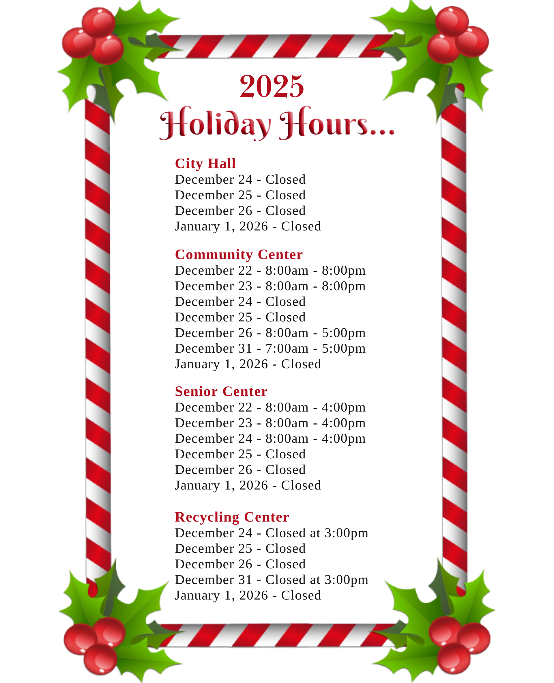 Non-essential city offices will observe the following hours for the Christmas and New Year’s holidays. Please note that emergency services remain available at all times.