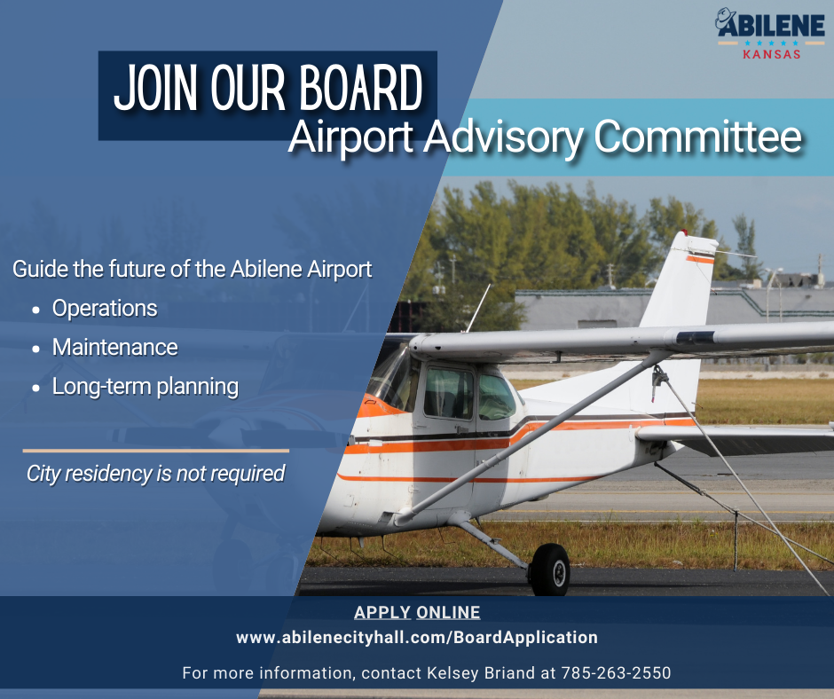 For more information about the advisory committee, visit https://www.abilenecityhall.com/383/Airport-Advisory or call Kelsey Briand at 785-263-2550.