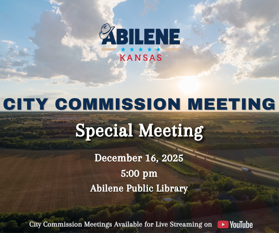 The City Commission will hold a special meeting on Tuesday, December 16, 2025, at 5:00 pm at the Abilene Public Library, located at 209 NW 4th Street.